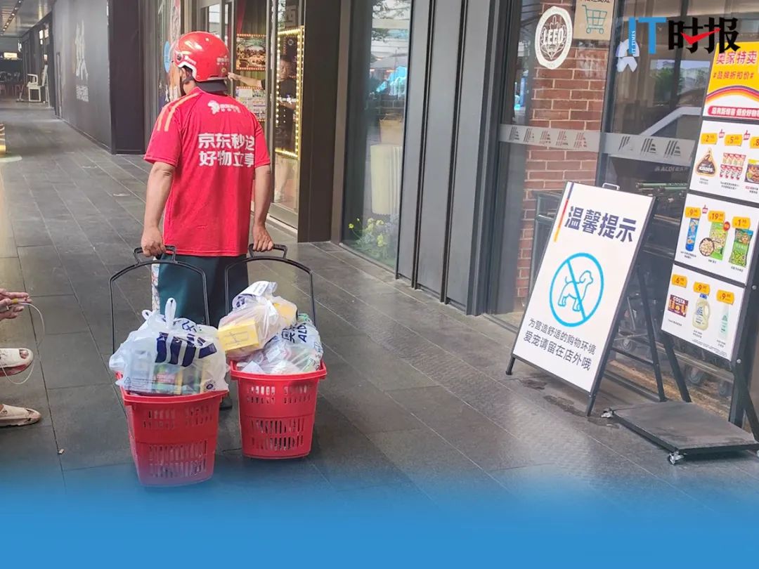 7月9日,《IT時報》記者走進上海蘇河灣奧樂齊超市,穿過冰鮮區後,一扇小門後是另一番忙碌景象:貨架上堆滿打包好的商品,揀貨員推着購物車,一路小跑扎進貨架區,馬不停蹄開始新一輪揀貨。