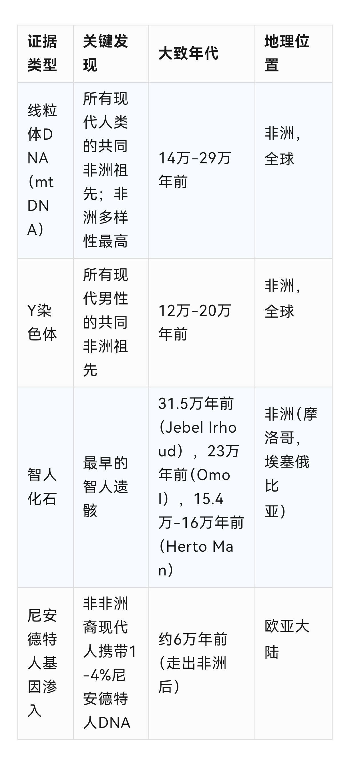 事實辨析:“近期非洲起源説”(Recent African Origin, RAO),通常被稱為“走出非洲説”,是關於解剖學意義上的現代人類(智人)起源的壓倒性科學共識。這一共識建立在來自多個科學領域的可靠且相互印證的證據之上。