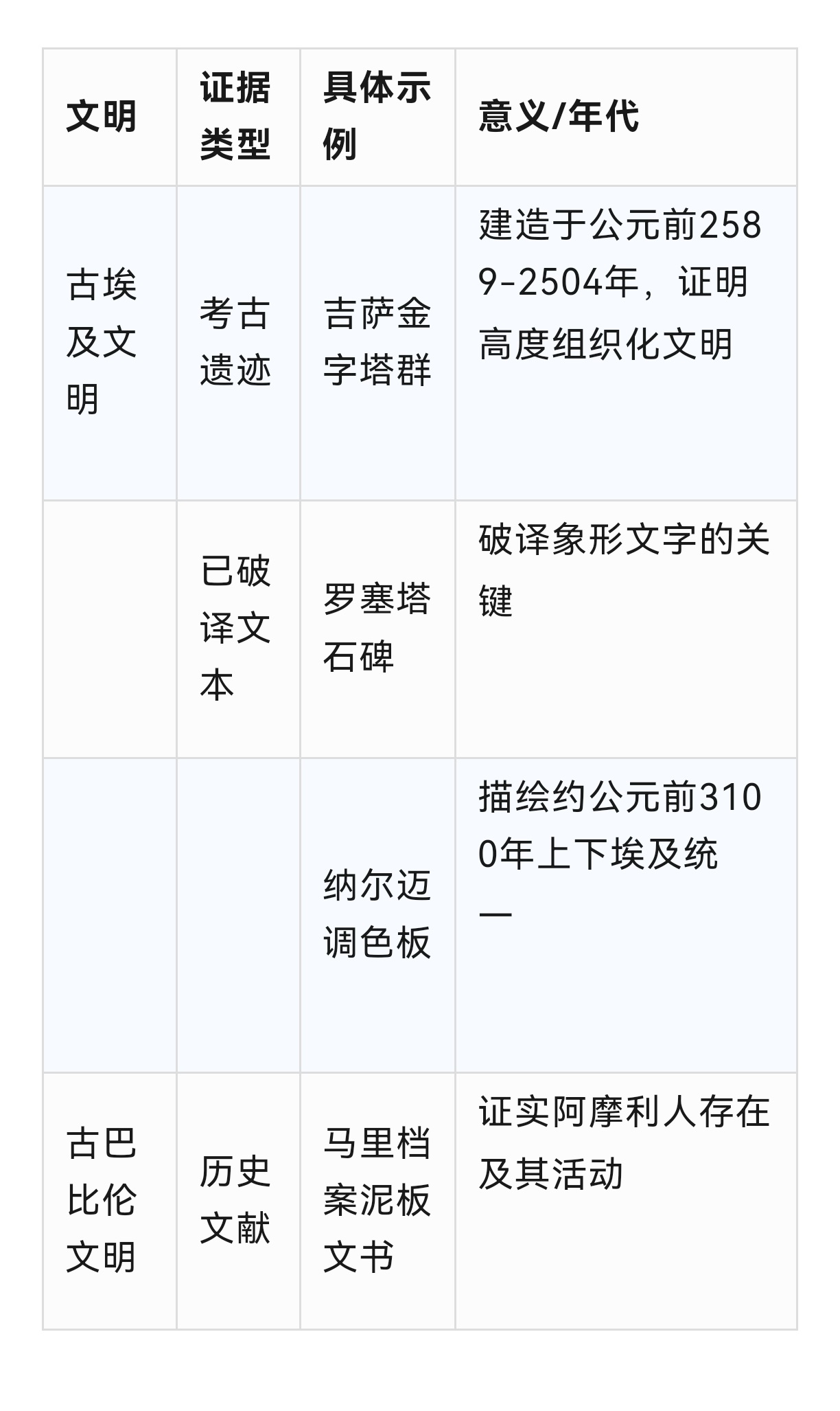 事實辨析:學術界的共識是,古埃及和美索不達米亞文明是經過大量考古發現和已破譯的同期文本所重建的、有充分歷史依據的真實存在,這些重建完全獨立於《聖經》敍事。