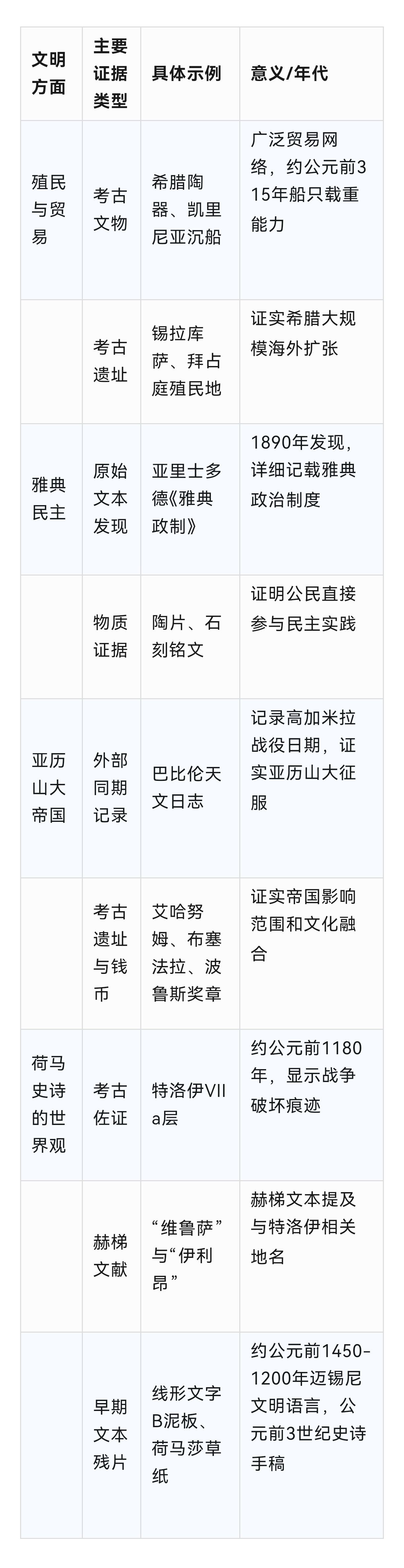 荷馬史詩的歷史基礎:荷馬史詩並非純粹的神話,其背後有歷史基礎。19世紀德國考古學家海因裏希·施裏曼(Heinrich Schliemann)對希薩利克(今土耳其)的挖掘揭示了特洛伊古城的多個地層。其中特洛伊VIIa層(約公元前1180年)顯示出暴力破壞的痕跡,包括燒焦痕跡和倒塌的磚石,這與特洛伊戰爭的傳統年代相符。同期來自安納托利亞的赫梯文本提及一個名為“維魯薩”(Wilusa)的地方,學者普遍認為這與特洛伊的另一個名稱“伊利昂”(Ilion)相對應。線形文字B泥板(邁錫尼希臘語行政文本,約公元前1450-1200年)包含與荷馬史詩中世界相符的地名和人名。現存最早的《伊利亞特》和《奧德賽》莎草紙殘片可追溯至公元前3世紀(如P.Petrie I),遠早於文藝復興時期。這駁斥了史詩在中古或近代被“偽造”的説法。