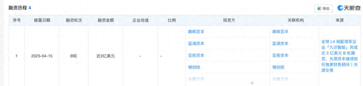 九識智能方面,公開數據顯示,截至 2024年底,在手訂單超萬台,累計交付超3000台。天眼查APP顯示,九識智能今年4月份完成了近3億美元的B輪融資。