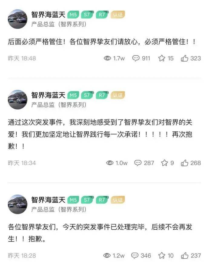 除了高管的言行失當,智界在直播營銷方面也屢遭挫折。日前,智界的視頻號因直播風雲系列新品,遭到眾多觀眾吐槽,網友紛紛留言表達對這種行為的不認同,“居然蹭智界的流量”。不久,直播被緊急掐斷。輿論發酵後,海藍天在六分鐘內連續兩次對此緊急致歉、安撫受眾,通過鴻蒙智行APP發佈數條內容。海藍天表示突發事件已處理完畢,後續不會再發生,並強調會嚴格管控。但網友對此並不買賬。他們認為,智界作為高端智能汽車品牌,應更加註重營銷活動的專業性和規範性,而非一味追求熱度而忽視品牌形象的維護。