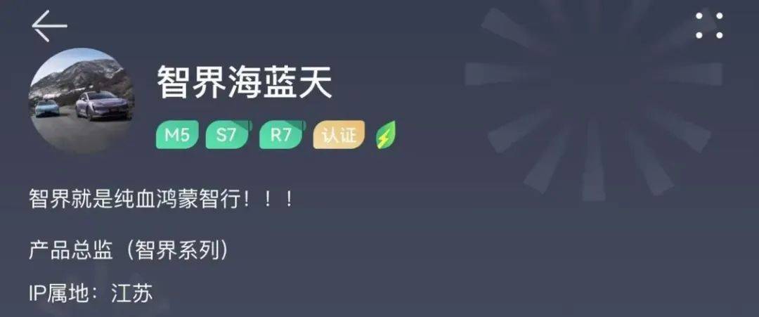 無獨有偶,海藍天在其主頁上的簡介也受到網友廣泛關注。其在簽名欄處寫道,“智界就是純血鴻蒙智行”,附以三個感嘆號,也引發了廣泛爭議。在鴻蒙智行體系下,問界、享界、尊界和尚界等品牌並存,海藍天的此番言論被指意有所指,引發了不必要的猜測和對比,進一步加劇了品牌內部的競爭氛圍。海藍天關於“純血鴻蒙”的相關表態,讓網友反向猜測其意有所指,“哪家不是純血鴻蒙智行”。