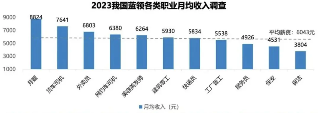 據《2023中國藍領羣體就業研究報告》顯示,2023年藍領羣體的月均收入為6043元;而統計局公佈的2023年全國城鎮私營單位就業人員年平均工資為68340元,月平均為5695元。
