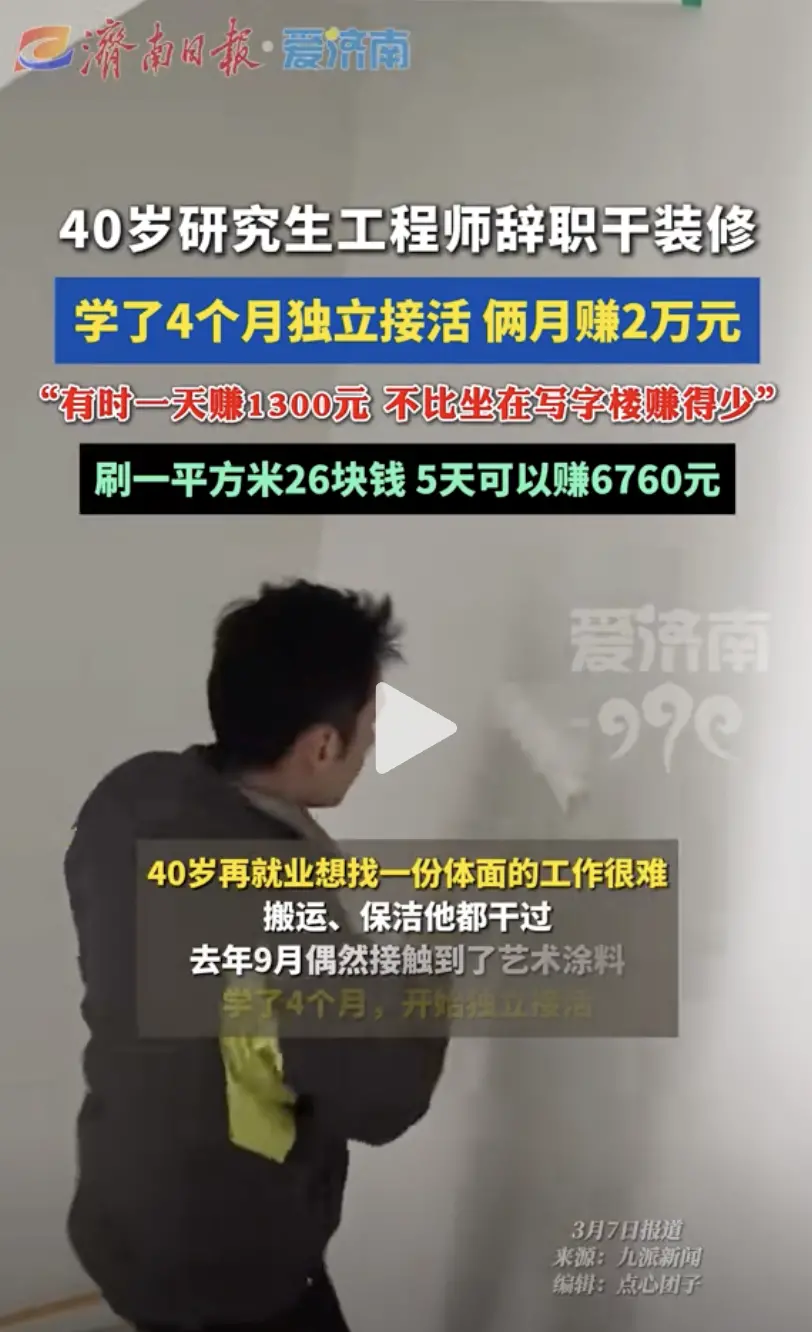 三個月前,40歲研究生工程師辭職幹裝修,學了4個月藝術塗料,開始獨立接活的新聞,曾刷屏互聯網。