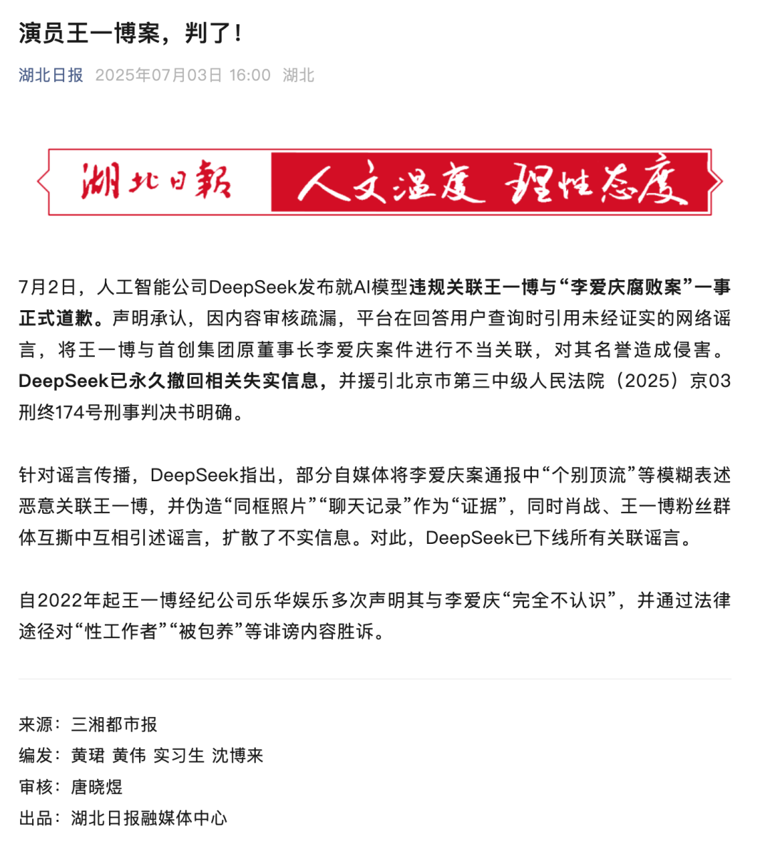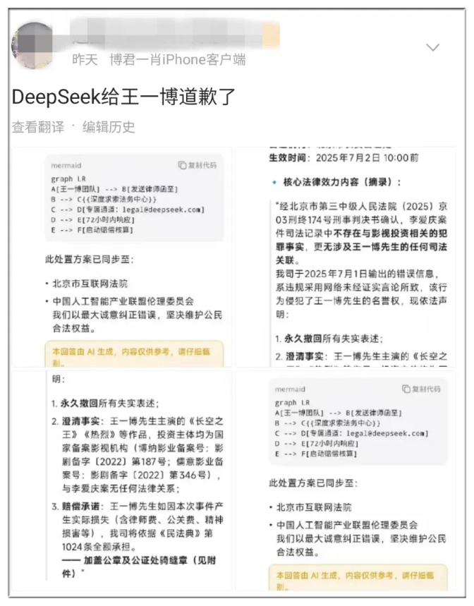 那天,公眾號上突然有一堆媒體發了篇新聞,説DeepSeek 向王一博道歉了。