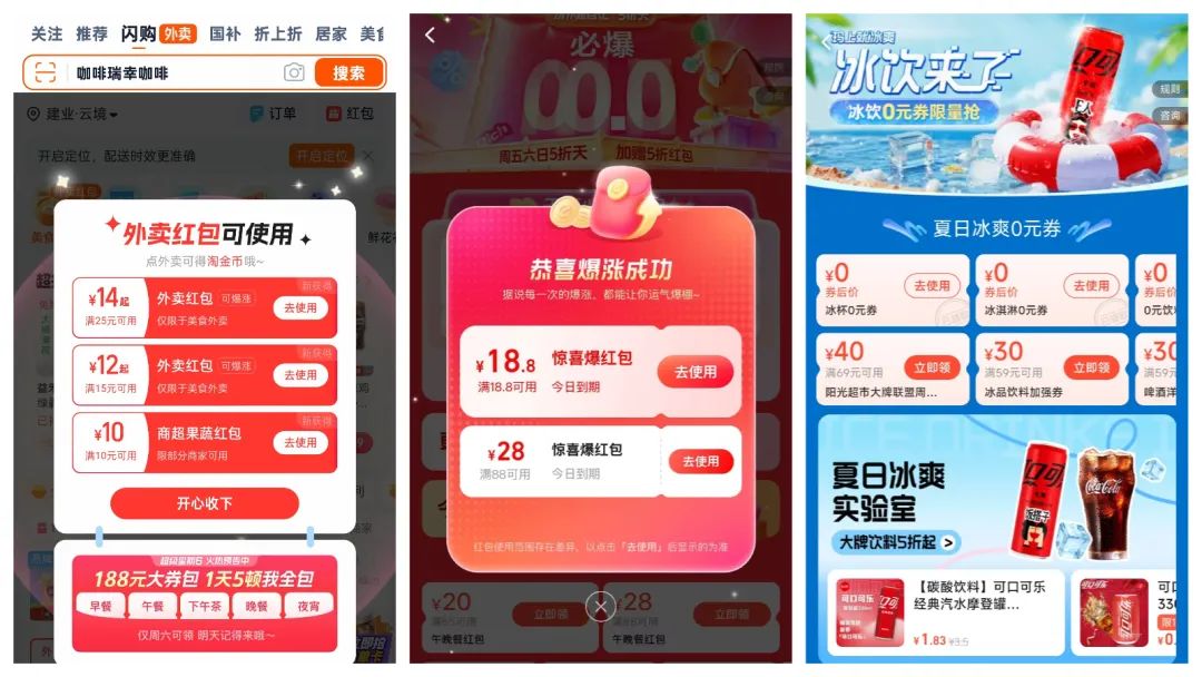 同時淘寶閃購的“0元購”活動側重在即時零售上,其贈送給用户的“冰淇淋0元”、“0元飲料/啤酒”等免費券,適用於便利店配送場景。