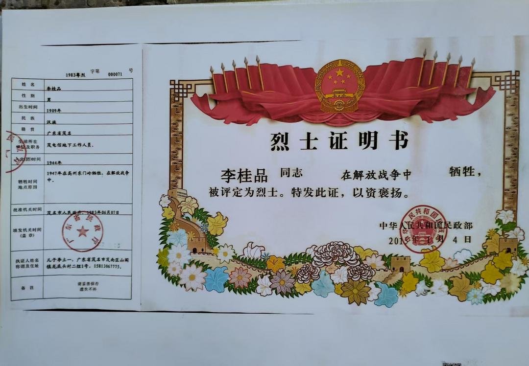 1945年,潛伏在國民黨部隊的中共地下黨員李桂品,因向茂名地下高州縣委傳遞情報致組織成功轉移,被敵人發現後殺害,時年36歲。父親犧牲後,母親改嫁,襁褓中的李立哲被村民李嶽品收養,並分得1.16畝魚塘作為生計來源。
