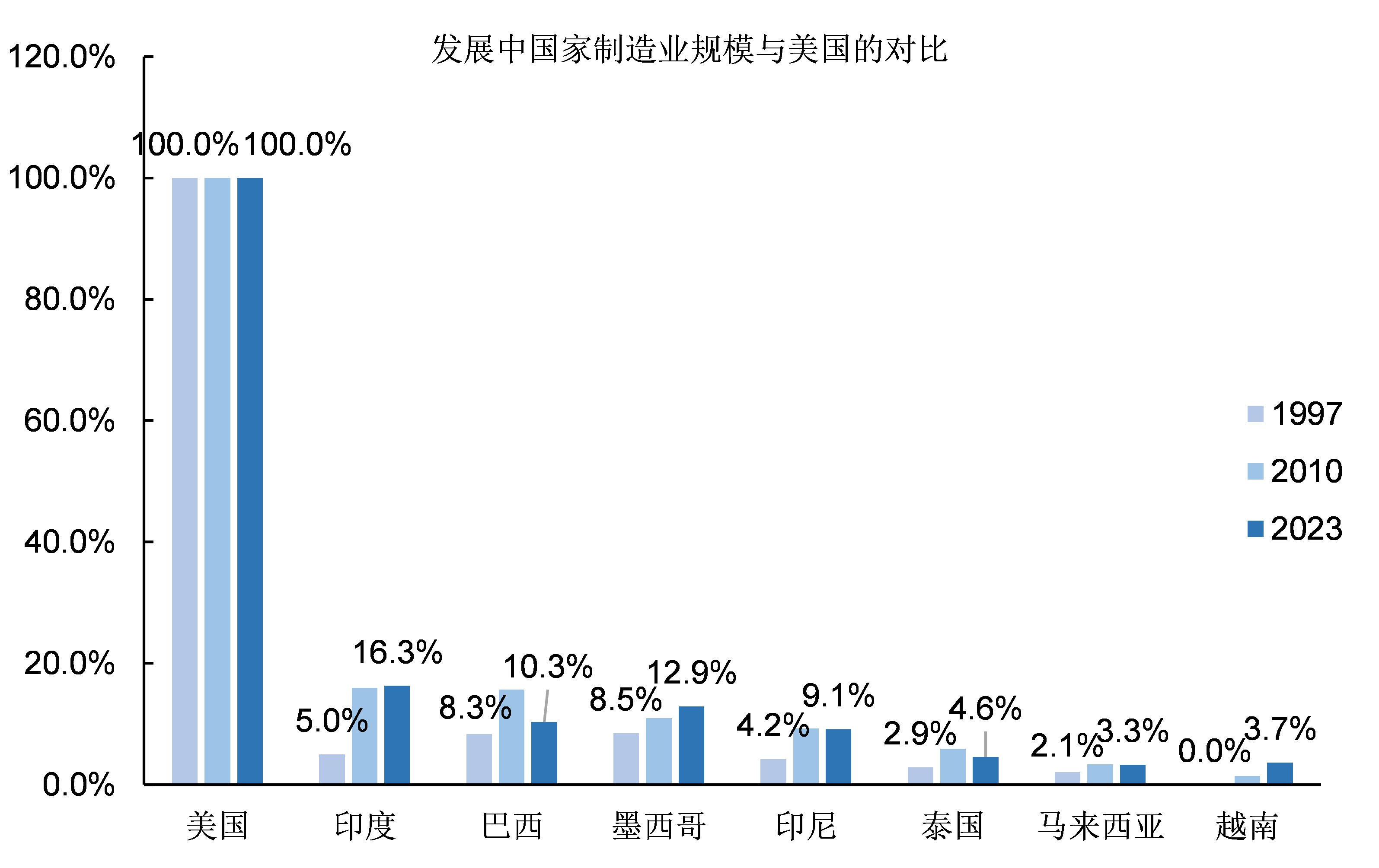 從1997年到2023年,印度、巴西、墨西哥和印尼四個國家制造業增長的幅度分別相當於美國的27.3%、12.3%、17.2%和14.0%。
