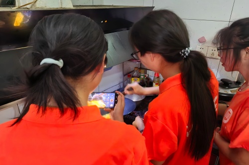帶着新鮮採摘的辣椒,團隊來到建平姐家中開啓美食製作環節。剁椒聲“咚咚”作響,灶台火苗歡快跳動,團隊成員分組參與辣椒醬製作和辣椒炒肉烹飪。在翻炒過程中,團隊成員認真記錄這辣椒與肉片奇妙的反應歷程,經大火爆炒,金黃的菜籽油與鮮紅辣椒碰撞,肉香與辣味“齊飛”,紅椒共長天“一色”。經過上午的勞碌後,團隊成員與建平姐一家共進午餐,品嚐黃荊坪辣椒製作的菜品。從田間到舌尖,這一條條鮮豔的辣椒承載的不僅是火辣的滋味,更是排頭鄉人代代相傳的生活智慧。