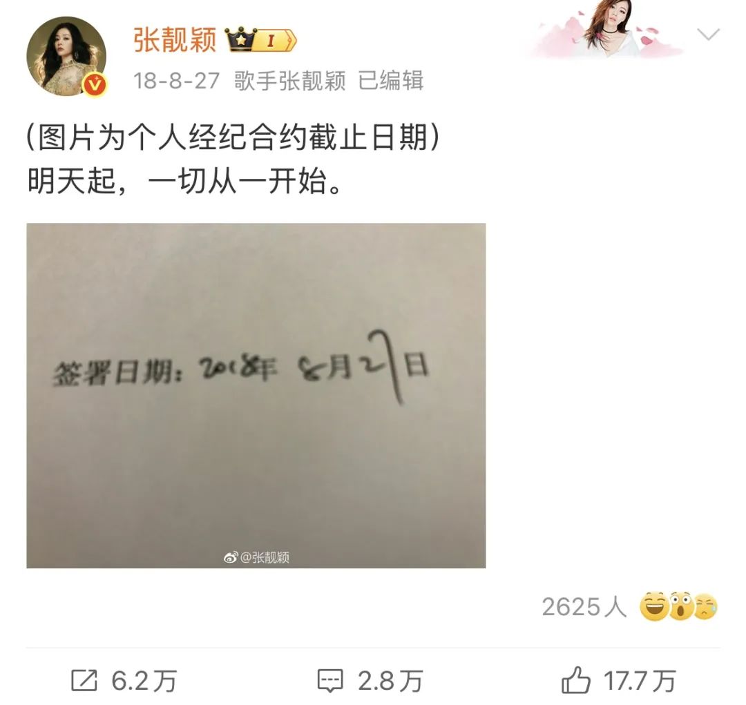 2018年8月,張靚穎在微博發佈個人合約到期截圖,配文"明日起,一切從一開始",標註"個人經紀合約截止日期",也隱隱暗示了兩人這段剪不斷理還亂的關係,終於劃上句號。