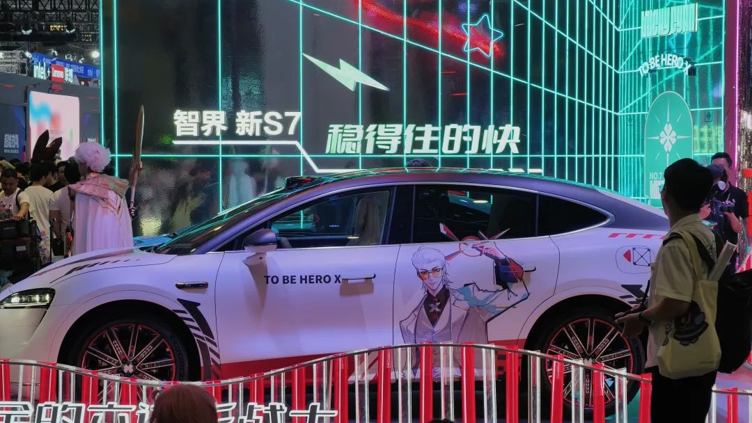 比如領克的都市遊樂場,就停了一輛跟即將發售的熱門遊戲《 明末:淵虛之羽 》聯動的定製痛車,智界則是聯動了《 凸變英雄 X 》。