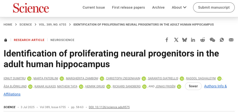 2025年7月3日,《科學》雜誌發表了一項由瑞典卡羅林斯卡醫學院Jonas Frisén教授領導的研究,該研究利用單細胞RNA測序、機器學習和先進成像技術,分析了24名年齡從出生到78歲個體的海馬體組織,提供了迄今為止最有力的遺傳證據,表明成年人類海馬體中存在神經發生,即使在高達78歲的老年個體中,神經前體細胞仍然存在並在某些情況下處於活躍分裂狀態。