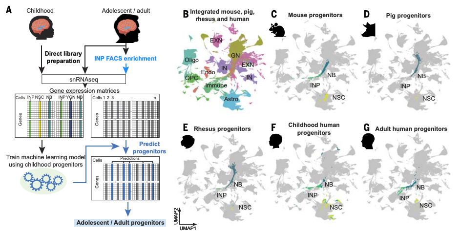 而為了從大量數據中準確識別神經前體細胞,研究還使用了機器學習算法。這些算法首先基於齧齒動物和嬰兒人類海馬體細胞的轉錄組數據進行訓練,學習神經前體細胞的特徵基因表達模式。隨後,將這些模型應用於成人樣本,最終研究人員識別出354個可能的神經前體細胞,佔總細胞數的不到0.1%。雖然數量很少,但也足以表明成年人類神經發生的確存在。
