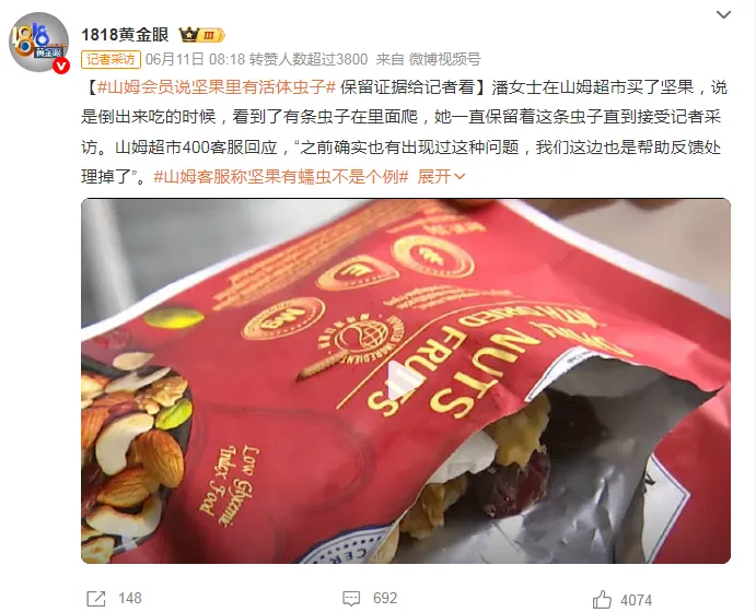 但是近年來,山姆會員店的食品安全問題猶如打開了“潘多拉魔盒”。網絡上各類吐槽層出不窮,從發酸的牛奶到瑞士捲裏的陳米,再到堅果裏有活體蟲子、滷菜標籤的“陰陽日期”等問題,頻頻被曝光,曾經的品質神話逐漸崩塌。