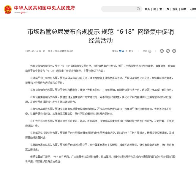 為規範促銷經營行為,維護“6·18”期間網絡交易秩序,保護消費者合法權益,近日,市場監管總局向綜合電商、直播電商、跨境電商等平台企業發佈“6·18”網絡集中促銷合規提示。