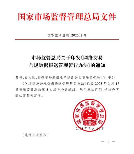 一、市監總局印發《網絡交易合規數據報送管理暫行辦法》:規範電商網絡交易合規數據報送行為