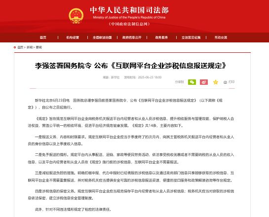 6月23日,為了規範互聯網平台企業向税務機關報送平台內經營者和從業人員涉税信息,提升税收服務與管理效能,保護納税人合法權益,營造公平統一的税收環境,促進平台經濟規範健康發展。國務院總理李強日前簽署國務院令,公佈**《互聯網平台企業涉税信息報送規定》**(以下簡稱《規定》),自公佈之日起施行。