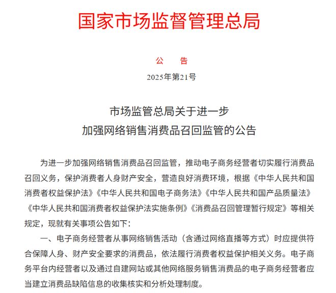 6月13日,市場監管總局發佈《關於進一步加強網絡銷售消費品召回監管的公告》(以下簡稱《公告》)。這一舉措直面“線上放心消費”的民生訴求,通過制度創新與監管強化,力圖破解召回難題,為消費者營造安全、可信的網絡消費環境。
