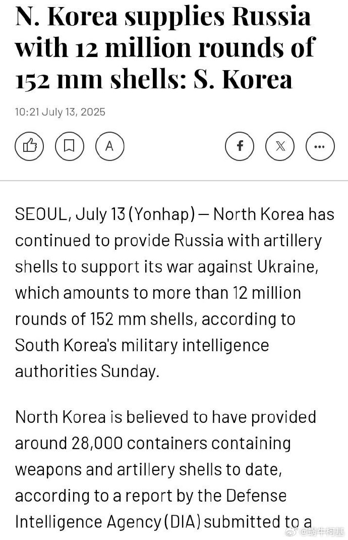 朝鮮向俄羅斯供應了約1200萬枚152/122mm炮彈!