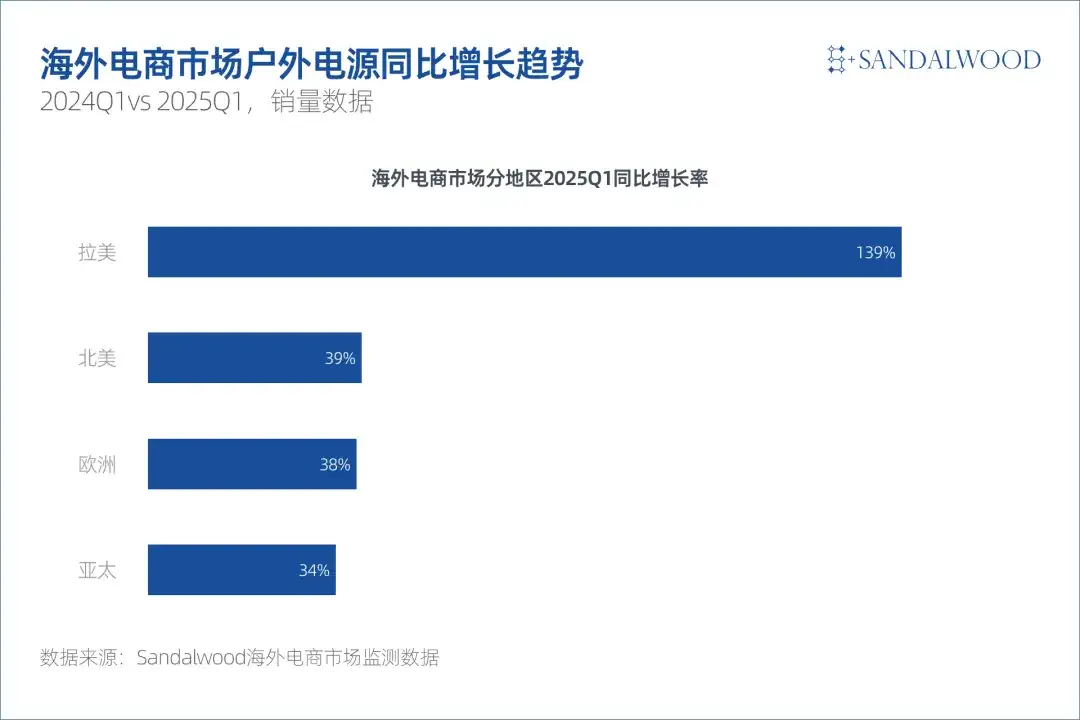 在當今數字化與移動化加速發展的背景下,户外便攜電源正逐步成為户外活動、旅行乃至日常應急場景中的關鍵設備。Sandalwood全球電商市場監測數據顯示,2025年第一季度,拉美同比增長率高達139%,北美、歐洲和亞太地區也均實現超30%的增長,全球户外電源市場正處於穩步增長的階段。