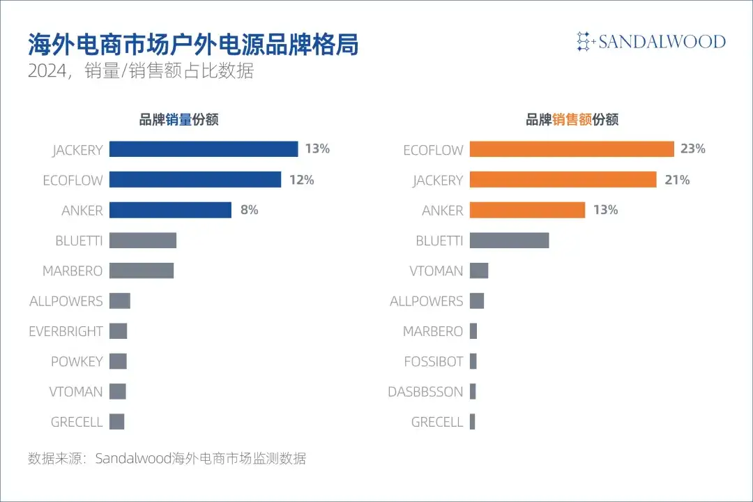 從海外電商市場的整體銷量來看,JACKERY 以 13% 的市場份額領跑,ECOFLOW以1%的差距緊跟其後,ANKER以8%的市場份額排名第三。從銷售額的份額來看,ECOFLOW以20%以上的份額顯著領先。