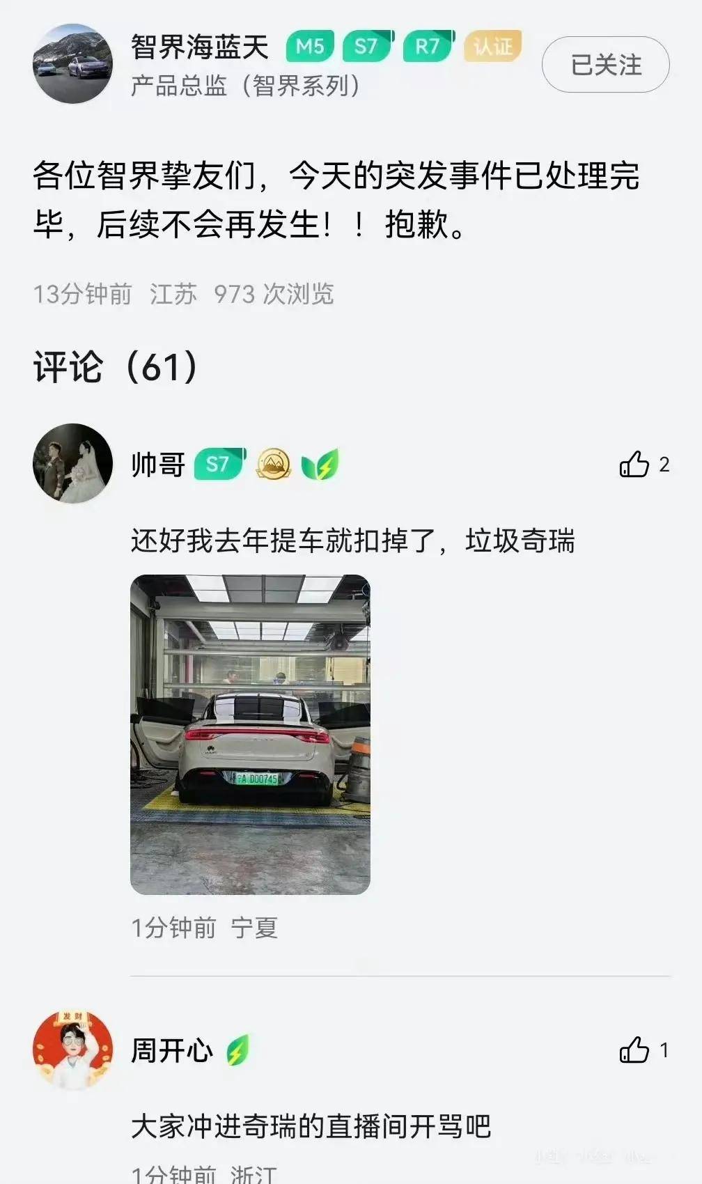 面對來勢洶洶的負面評價,智界智行迅速關掉了直播間,智界系列產品總監也連發三條動態道歉:“各位智界的摯友們,今天的突發事件已處理完畢,後續不會再發生!!抱歉。”