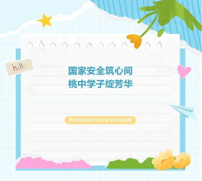 即日起,我們將在公眾號對四位同學的獲獎作品進行系列展示,以此激勵更多桃中學子從身邊小事做起,築牢國家安全的青春防線,讓總體國家安全觀在校園落地生根。敬請關注!