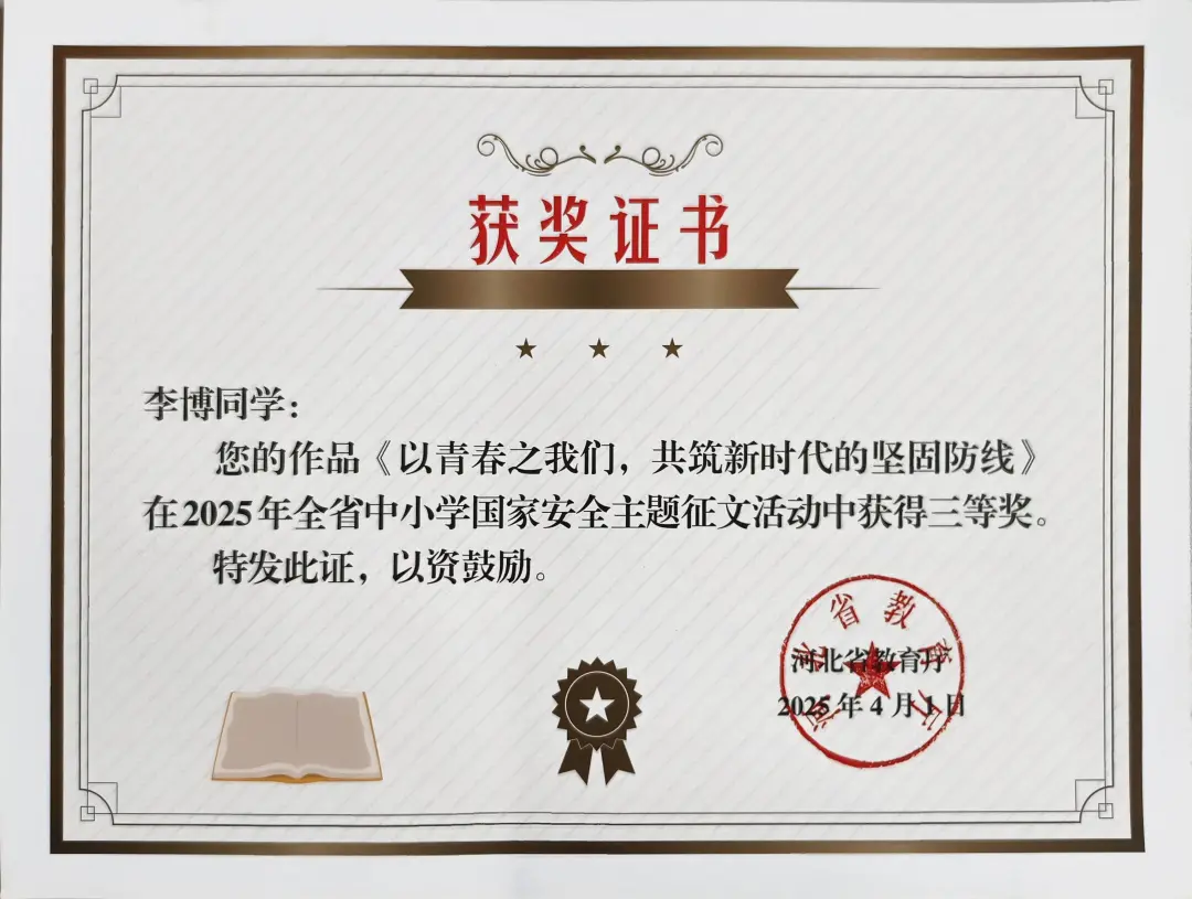 在此次活動中,我校25屆高三學子不負眾望,展現出對國家安全的深刻思考與積極踐行:李博同學榮獲三等獎,句梓涵、温妮、馬紫璇三位同學榮獲優秀獎,路曉宇老師榮獲優秀指導教師獎。他們的作品緊扣 “學習總體國家安全觀知識,做‘四有’時代新人” 的主題,以真摯的情感、鮮活的事例詮釋了新時代青少年對國家安全的理解與擔當。