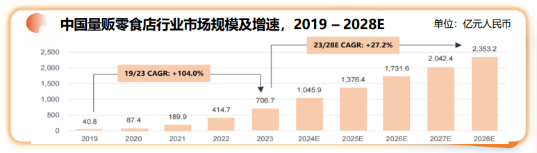 根據頭豹研究院數據,中國量販零食行業規模未來仍將保持高速增長,預計2023年至2028年年複合增長率為27.2%。增長動力主要來源於開店空間廣闊,以及承接零食消費者從其他渠道的消費轉移。