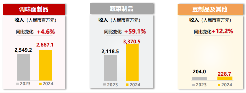 根據財報,期內,衞龍的調味面製品收入同比增長僅4.6%,約為26.67億元,佔總營收比重從2023年的52.3%下降至42.6%,不足一半;蔬菜製品收入大漲59.1%至33.71億元,佔比從43.5%增長到53.8%,成為公司新營收支柱;豆製品及其他產品收入同比增長12.2%至2.29億元,佔比下降至3.6%。