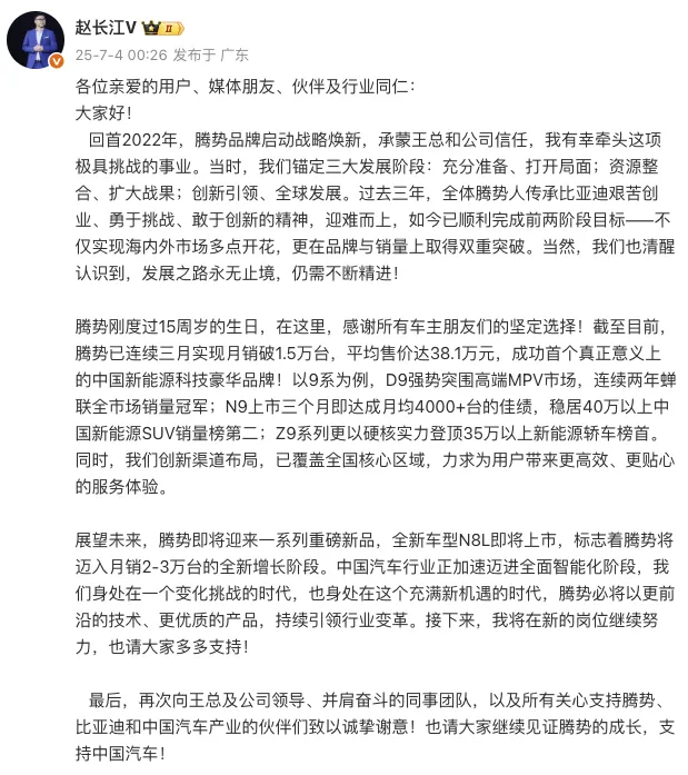 近期,並不走“流量”路線的騰勢,卻頻繁登上新聞頭條。換帥消息引發行業內外高度關注,**執掌騰勢品牌三年的趙長江,頭銜已經改為“騰勢方程豹直營事業部總經理”。**如今,騰勢銷售事業部總經理換成了李慧。