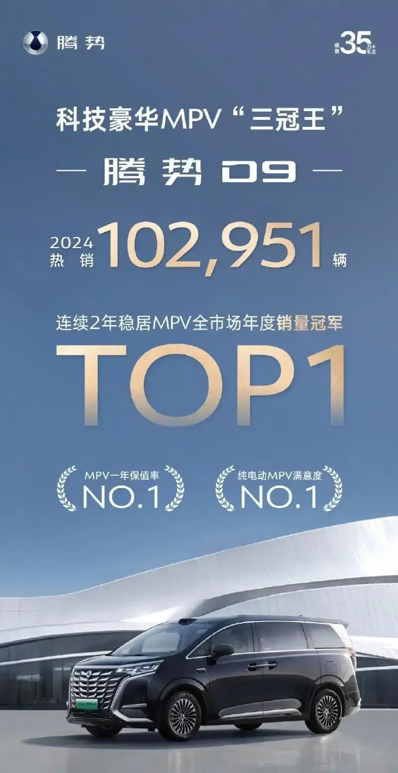 自2022年上市以來,它猶如一匹黑馬,迅速在MPV市場中嶄露頭角。官方數據顯示,2024全年,騰勢D9 的銷量達到了102951輛,連續2年奪得MPV全市場銷量TOP1。