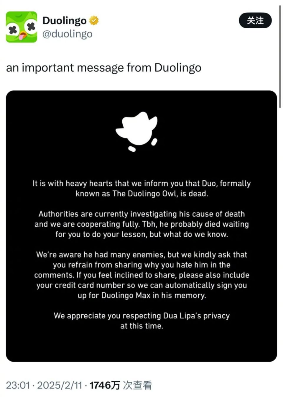 對此,多鄰國專門做了一個大型的測試。沒有依賴任何的熱點,多鄰國突然宣佈多兒死亡,並號召用户完成每日課程和任務來“復活多兒”,兩週時間,用户、明星、品牌各方的轉發,據社交媒體分析公司 Meltwater 稱,宣佈多兒去世的當天,多鄰國在社交媒體上的提及量激增超過25000%。