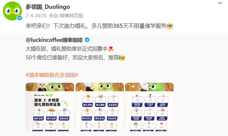 而這次婚禮,延續了多鄰國的“不搞事不罷休”原則。6月30日,多鄰國突然在各個社媒平台宣佈多兒將在7月結婚,各個品牌紛紛跑來認領“新郎”,“結婚證”P得滿天飛的時候,多鄰國官宣正統新郎是瑞幸“Lucky”。一鹿一鳥甚至還用三集短劇呈現了這場“世紀婚禮”。消息一出,不少品牌和網友紛紛跑來,開玩笑地指責“沾花惹草”的多鄰國犯了“重婚罪”。