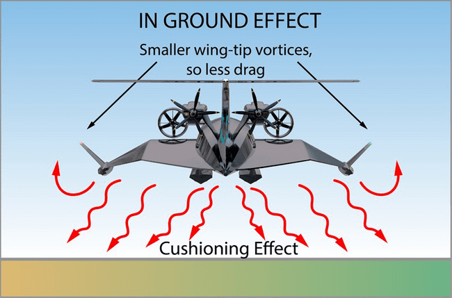 地效飛行的原理,簡單來説,是當某種飛行器在低空飛行時,它的機翼因為結構特殊,加上過於貼近地面,下方因為各種因素會導致空氣被壓縮,壓縮後的空氣相對於機翼上表面形成了一個高壓區,會增加升力。