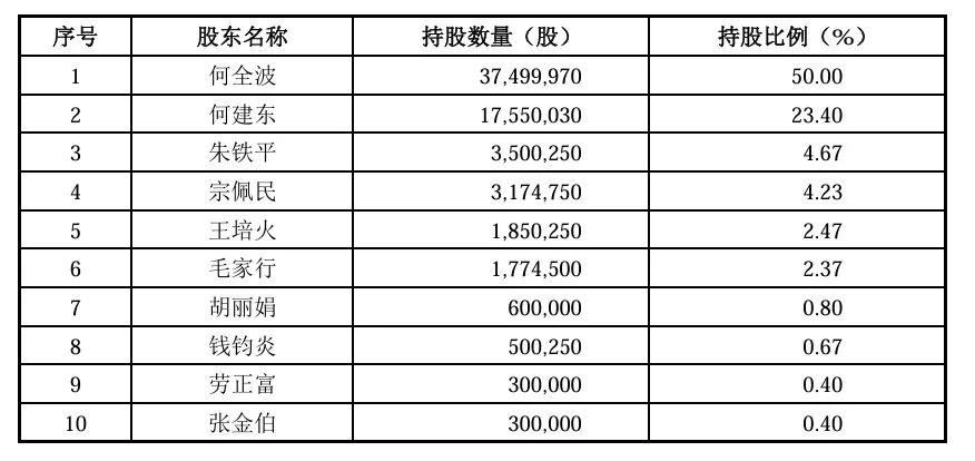 據申科股份首次發行股票招股意向書摘要披露,2011年,申科股份首次公開發行募集資金總額3.5億元,第一大股東何全波和第二大股東何建東為父子關係。何全波持有公司 50.00%的股權,何建東持有公司 23.40%的股權,何全波、何建東合計持有公司73.40%的股權。公司股東黃寶法為何全波配偶黃香梅之弟,持有公司0.27%的股權。按申科股份股票上市首日開盤價18.1元/股算,何全波家族當時身家市值約為10億元人民幣。