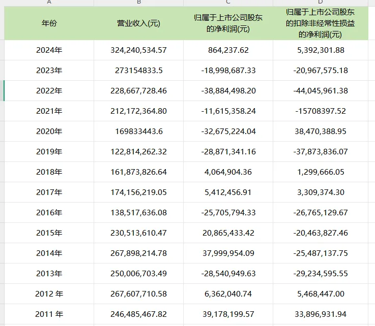 其中,2014年虧損近3800萬元,2022年虧損約3888萬元。即便盈利年份,公司利潤也十分微薄,盈利最多的2011年淨利潤為3918萬元,2024年轉虧為盈,營業收入創歷史新高約3.24億元,歸母淨利潤約686萬元。2025年一季度公司營業收入約7090.30萬元,歸母淨利潤僅86.03萬元,同比增長15.41%。