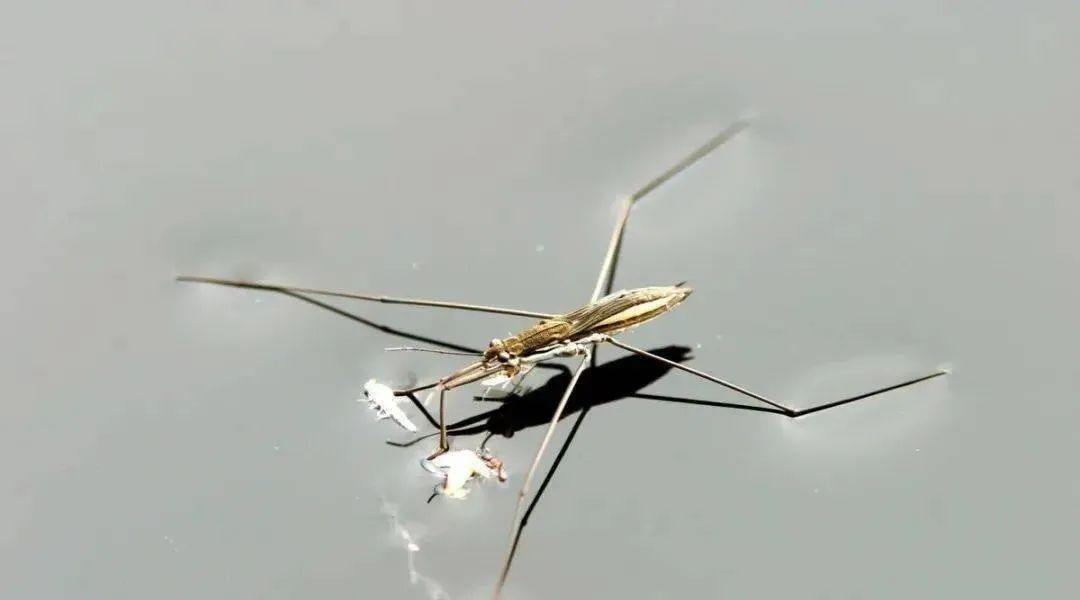 主要在水面活動的水黽(屬於黽蝽科),之所以能輕盈穿過水麪,而不被表面張力困住,除了靠其迷人大長腿外,還需要超疏水性“腿毛”加持: