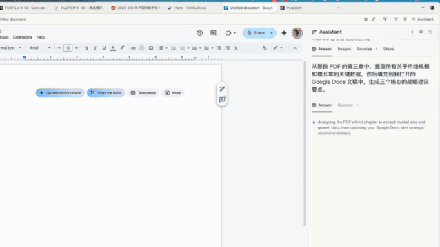 假如你正在撰寫一份市場分析報告,你的標籤頁裏有一份 PDF 行業研究、一個 Google Sheet 數據表格和你的 Google Docs 報告草稿。你可以直接對 Comet 下達一系列連續 Agent 指令:「從那份 PDF 的第三章中,提取所有關於市場規模和增長率的關鍵數據,然後填充到我打開的 Google Docs 文稿中,生成三個核心的戰略建議要點。」