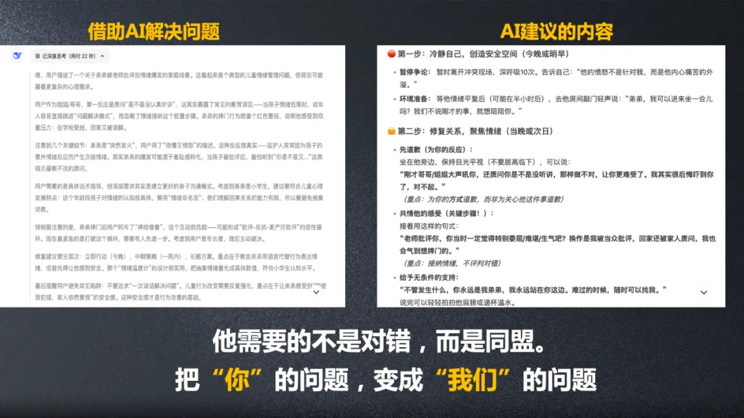 這個時候我就在想,我平時也在研究AI應用,那我是不是可以嘗試,用AI去幫助我去解決育兒中的一些問題呢?我就把我經歷的這個情境輸入給AI,AI給我的回覆讓我感到眼前一亮,它並沒有直接給我講教育方面的大道理,而是非常具體的告訴我孩子們可能的角度是什麼,以及教會我去説如何説孩子們能夠聽懂的孩子話。