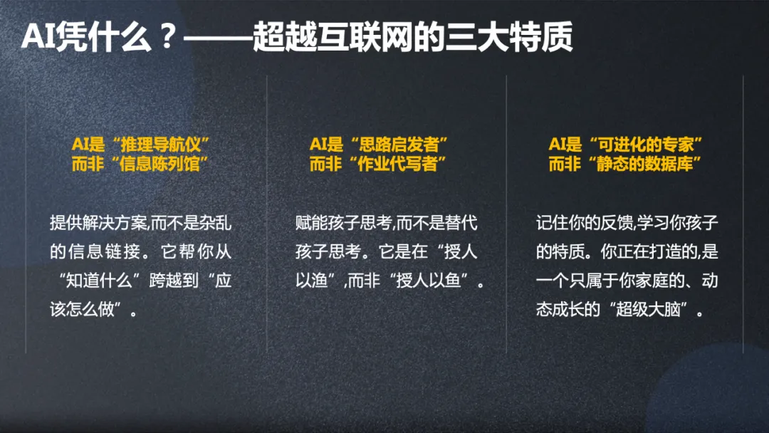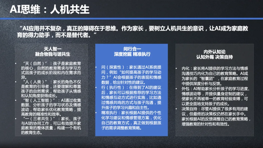 比如説信息分析和邏輯推理,我們作為家長就做我們擅長的事情,那就是情感的連接、價值的引領和最終的判斷和決策,當我們樹立起來AI思維,那AI未來才能成為我們每一個家庭的合力。