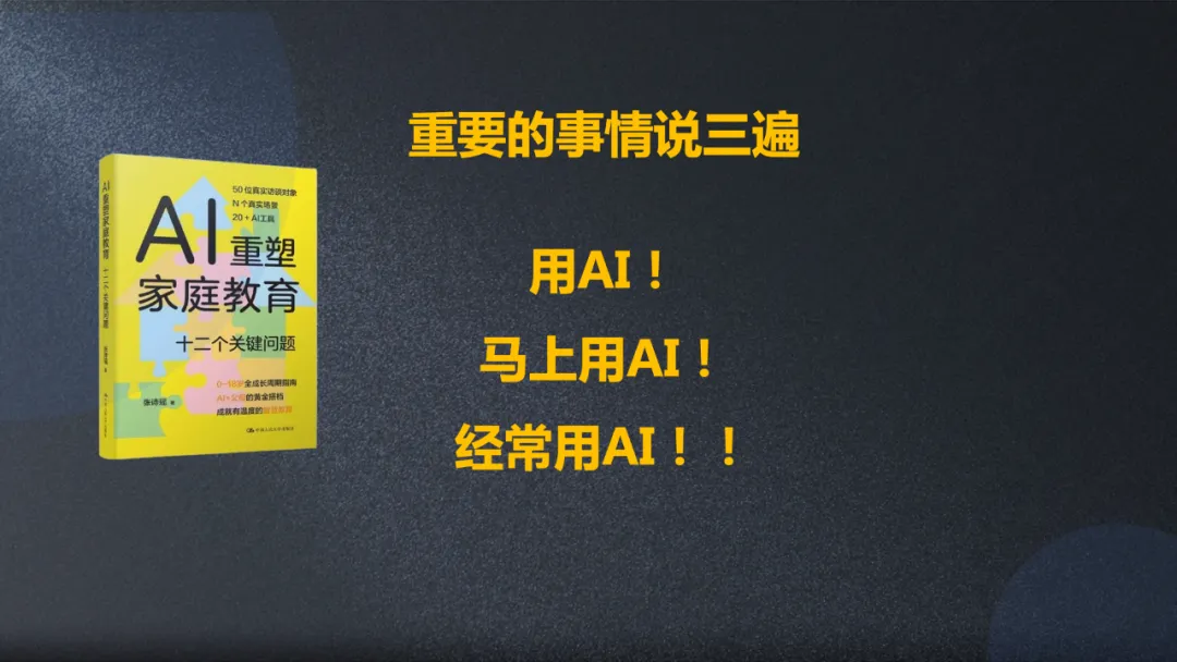 最後,重要的事情説三遍,大家用AI、馬上用AI、經常用AI,今天晚上我們回去就可以用AI去,讓孩子們去畫畫,去批改一下作業,去分析一下我們情感的問題,到底孩子是因為什麼和我們產生了隔閡,好不好,謝謝大家。
