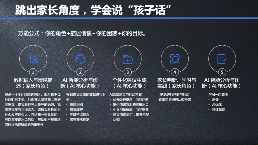 我們家長要做的是什麼呢?就是我們在事情發生的當下,先嚐試去跳出我們自身固有的那個認知框架,停下來,然後問AI,對AI給出的內容,我們要進行一個判斷、學習和行動,最後一步也很關鍵,就是我們要和AI去反饋到底哪個方案對我自己的孩子最為適用,因為這個是讓AI更加了解我們自己孩子個性的一個步驟和過程。