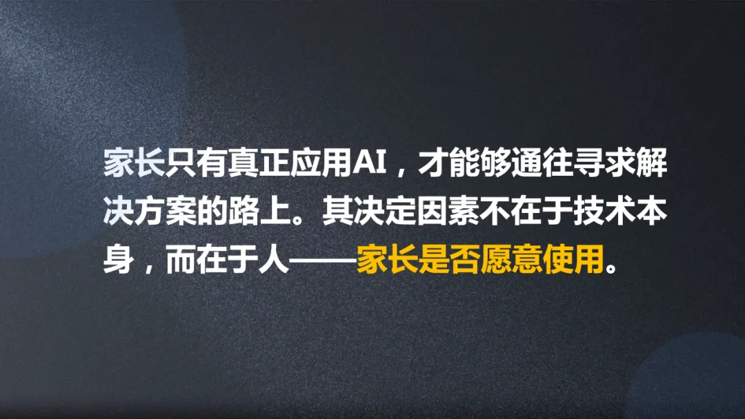 這就是我所説的家庭教育平權,讓優質的教育資源最大限度的普惠到每一個角落,它已經開始逐漸成為促進家庭教育公平的最大公約數,而家長呢,只有真正的應用AI,才能夠通往我們試圖去尋找的解決的方案的路上,決定因素不在於技術本身,而在於我們作為人、作為家長是否願意使用。