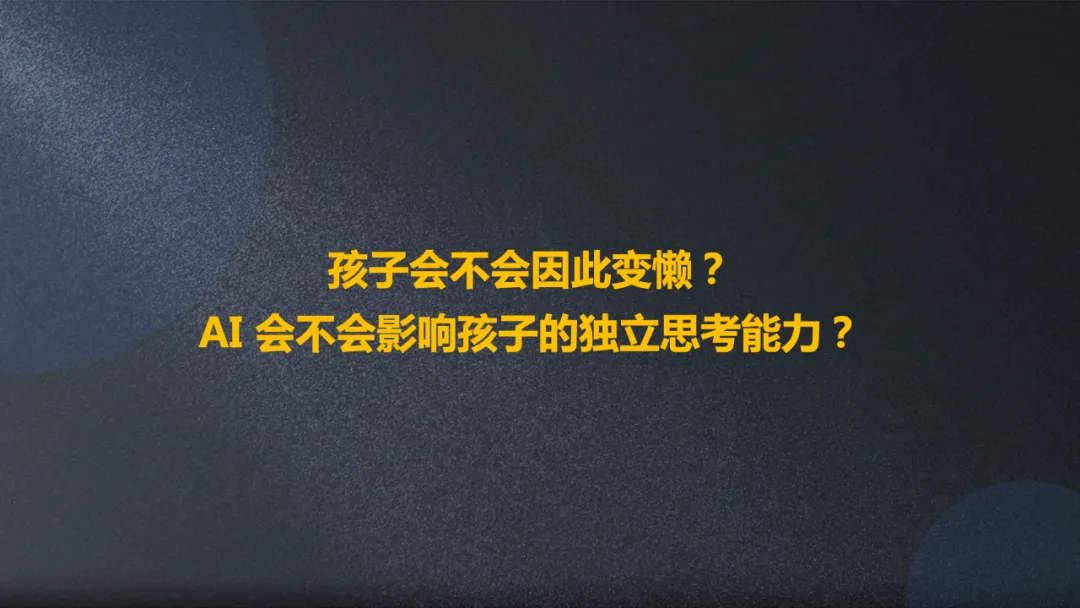 當然説到這,也有很多家長説,那你説AI這麼好用,我就不信它沒有弊端,那AI會不會讓孩子變懶,那AI會不會影響孩子的獨立思考能力,大家考慮的問題是存在的,它一定是存在的,但是如果我們只是把AI當成答案生成器來用,那肯定是不行的。