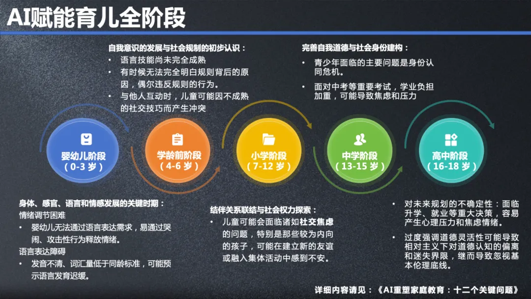 AI賦能我們育兒的全階段的,從0~3歲,我們對孩子基本的一個安全感的建立;到4~5歲,我們去教會孩子如何去進行情緒管理;再到7~12歲,我們重心放在如何去培養孩子的一個學習習慣;以及13~15歲我們要去培養他們如何去進行批判性思考、獨立思考;再到16~18歲,我們幫助他們一起做專業的規劃和職業的規劃。每一個階段我們其實用AI,都能夠去在裏面扮演着可以使用的一個角色。