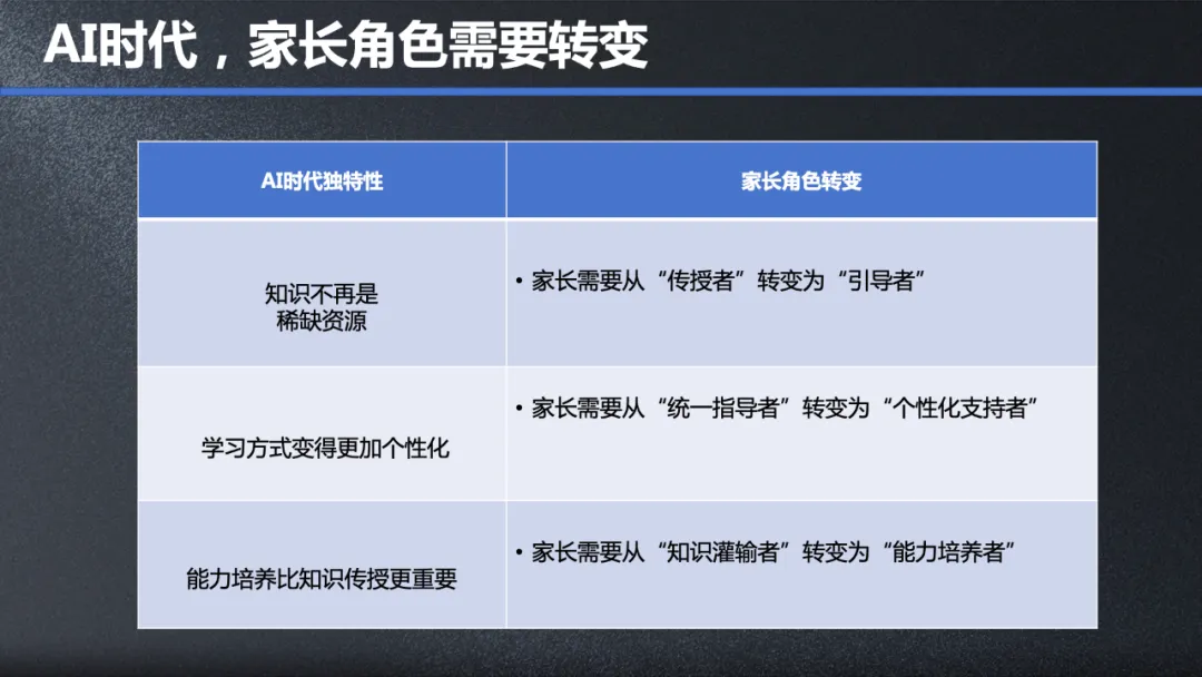 比如説,我們過度放手、角色混淆、期望過高或者是忽視情感需求等等,這意味着在未來的這個AI時代,家長的角色並不是弱化了,所以我們不用太焦慮,而是我們的角色變得更加重要了,要轉變好AI時代家長的新角色,我們需要完成的是思維和認知層面的升級轉變。