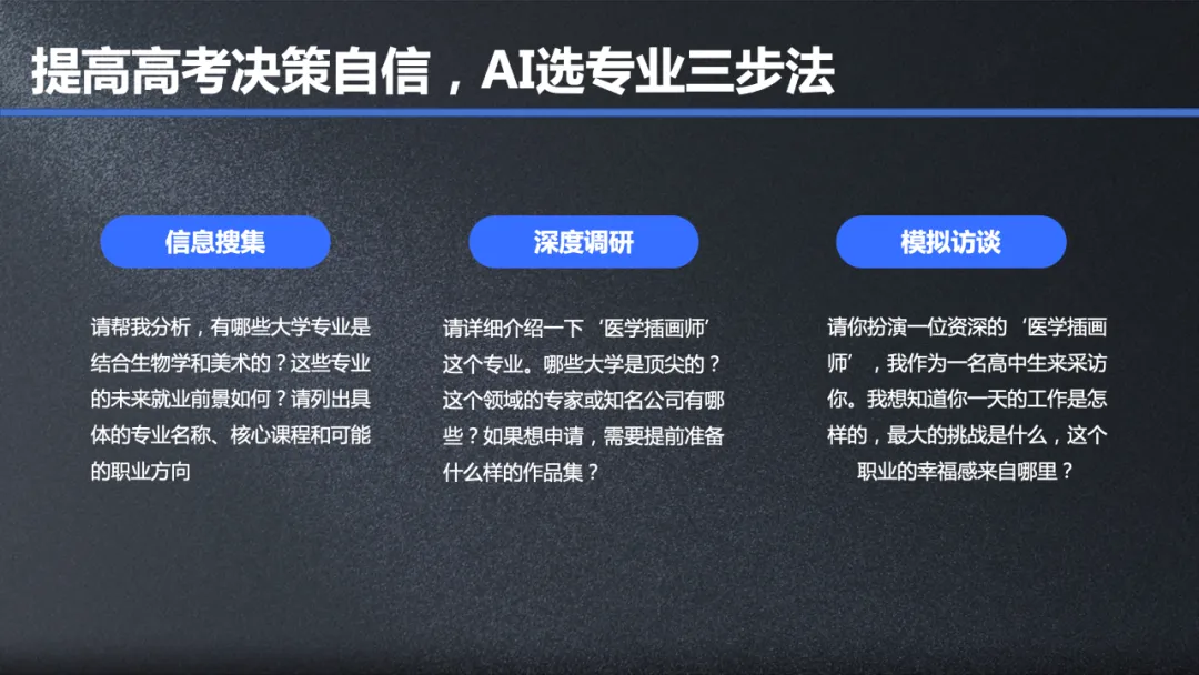 第四個法寶,就是幫助我們去提高在未知領域的決策力,比如説,現在我們高考剛剛結束,我們孩子上大學選專業報志願,全家都非常焦慮。我一個親戚家的孩子,是個女孩,她自己是喜歡生物,但她美術也特別好,想選美術專業,但是父母很愁啊,覺得學生物之後是能找到好工作、好出路的,但是學美術可不一定,這是她父母的判斷。兩代人僵持不下,後來我就教他們用AI,分步驟三步走。