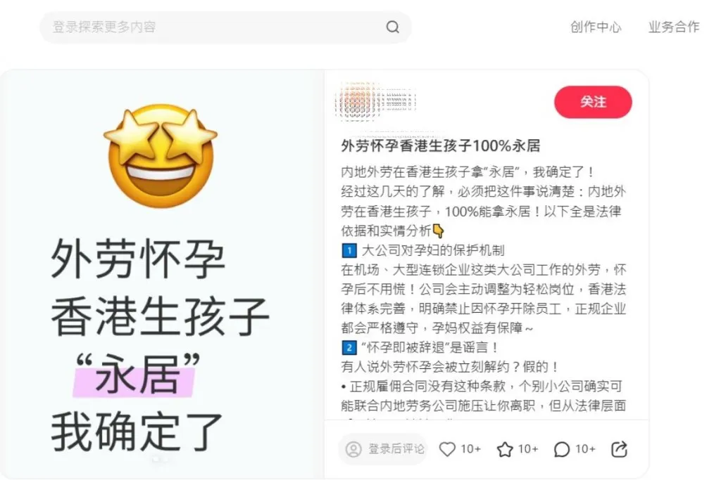 內地社交平台“小紅書”近日流傳一則帖文,傳授“外勞懷孕香港生孩子100%永居”攻略,聲稱內地女性可經香港各類輸入勞工計劃赴港工作,為下一代覓得香港永久居民身份;帖文強調只要是逗留期間“意外懷孕”,孩子必可獲得永居身份。